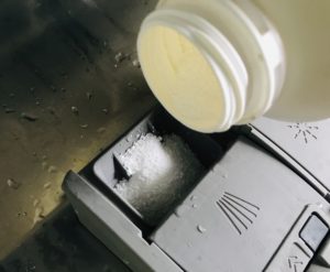 1 cs du mélange à chaque lavage dans le bac pour la poudre de votre lave-vaisselle. Gicler quelques « sprutz » de vinaigre dilué dans la machine et lancer le programme éco.
